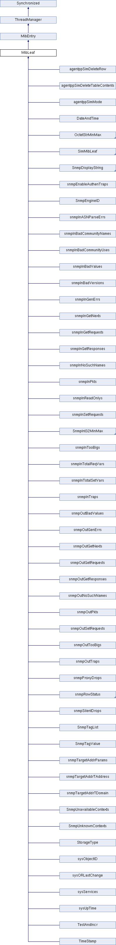 MibLeaf is a sub-class of the abstract MibEntry class. As MibLeaf represents a managed object instance a MibLeaf object contains management information. So each MibLeaf object contains a pointer "value" to that management information which can be any object derived from SnmpSyntax.