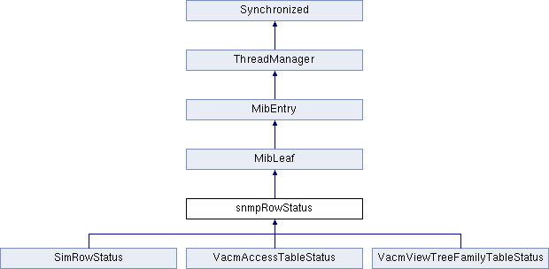 The snmpRowStatus class is derived from MibLeaf and provides functionality to control the manipulation of MibTable rows.